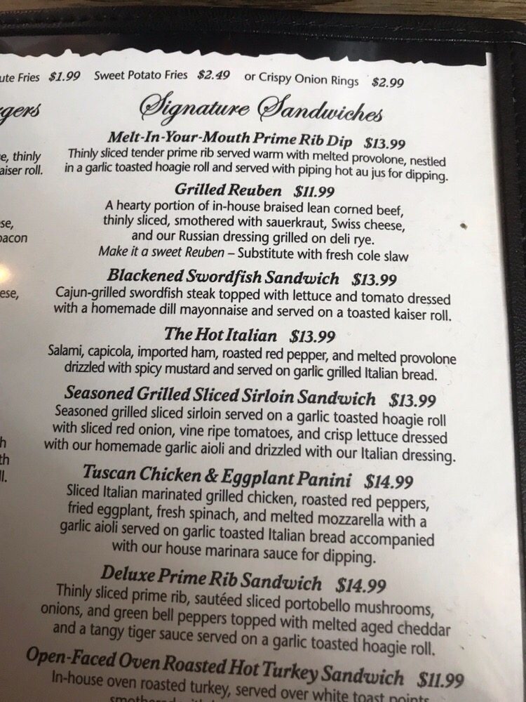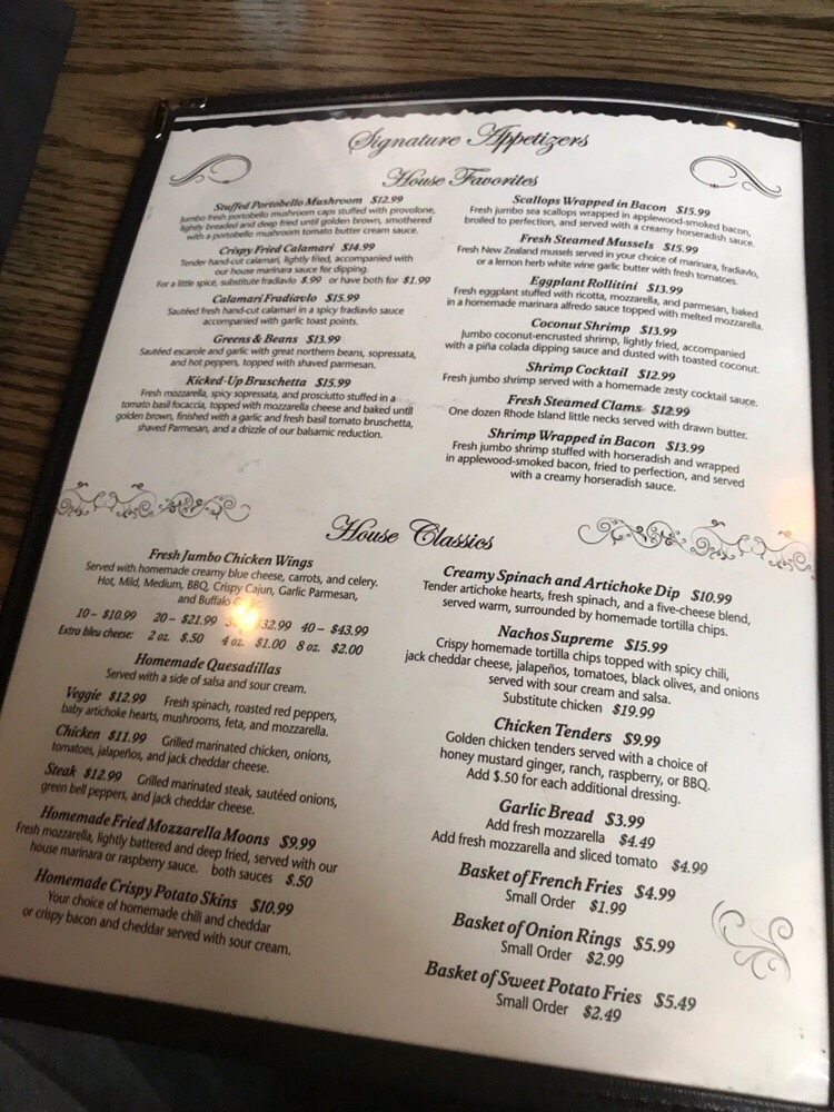 Appetizers Soups & Salads Burgers & Wraps Sandwiches Pasta & Eggplant Chicken Veal & Steak Seafood Pizza Kids & Desserts Sides & Extras Late Night Menu Holiday Specials N/A BVG Platters, Subs & Dips Tapas & FingerFoods Pasta & Italian Specialties Chicken & Veal Seafood & Comforts Salads, Sides & Extras